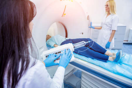 Doctor or nurse and patient with tomography CT or MRI Scan in hospital. Interior of radiography department. Technologically advanced equipment in white room. Magnetic resonance diagnostics machine