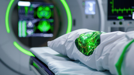 This image showcases an advanced medical imaging setup featuring a patient pillow and green light elements, symbolizing comfort and innovation in healthcare.
