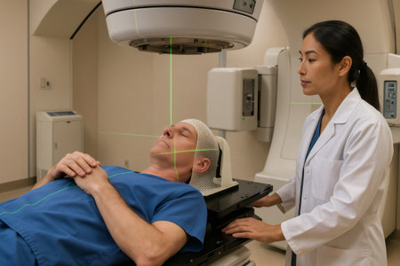 Medical professional preparing patient for stereotactic radiosurgery, ensuring precise targeting using advanced linear accelerator technology