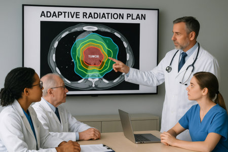 Medical team collaborating on an adaptive radiation plan for lung tumor treatment during an important meeting focused on patient care