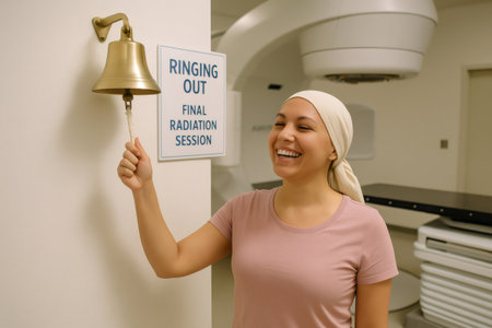 Smiling patient ringing celebratory bell, marking the end of radiation therapy, feeling joyful and hopeful for recovery