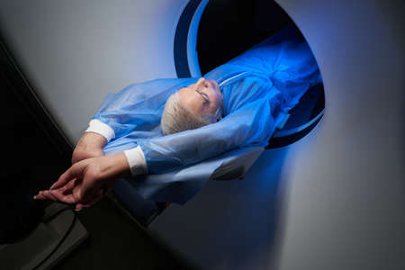 Senior Caucasian woman wearing blue patient gown lying on CT scanner bed in modern clinic