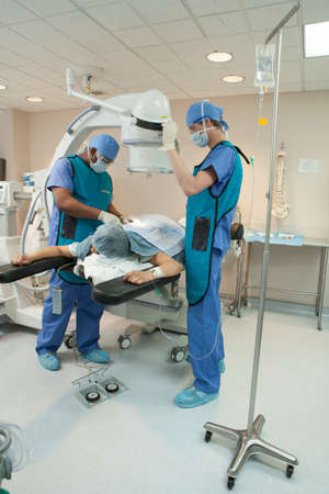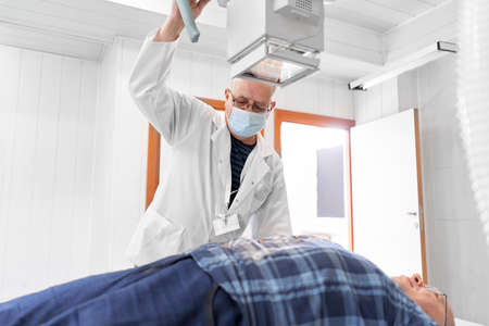 Doctor using a x-ray machine with a patient lying on a hospital room