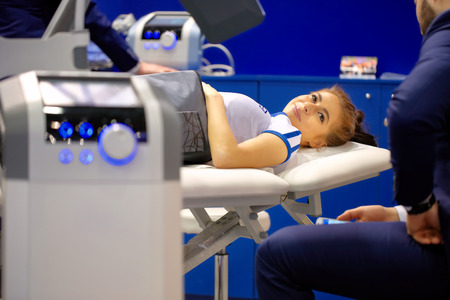 POZNAN, POLAND - APRIL 12. 2016: The patient on the treatment bed. Poznan International Fair SALMED 2016, Poland.