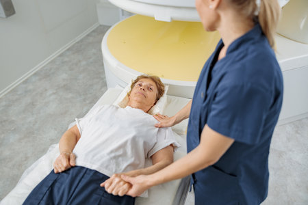 Attentive doctor assists female patient as she prepares for an MRI scan in a modern hospital.