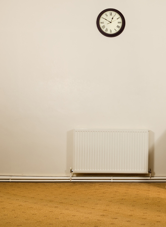 An empty retro vintage room with a blank cream white wall with an old radiator and old clock. perfect for posters and type for graphic design background. vintage interior