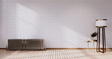 radiator heating device against a white brick wall. cozy house with modern interior room close up