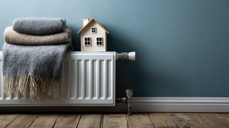A serene domestic scene featuring a soft blanket draped over a white radiator, accompanied by a miniature house, perfect for showcasing cozy living.