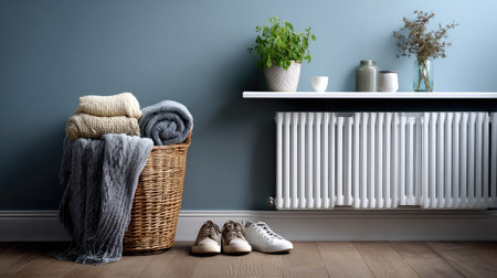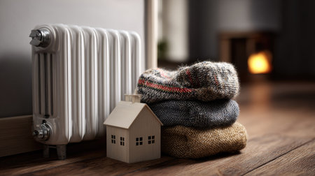 A serene indoor setting featuring a white radiator beside neatly stacked warm sweaters and a small wooden house. This image captures comfort and warmth in a cozy home environment.