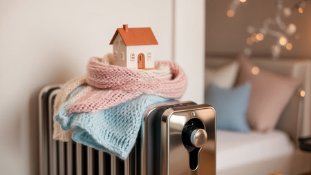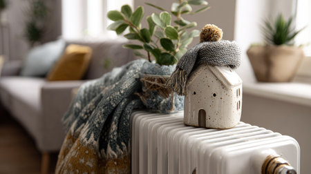 A cozy home scene featuring a decorative house figurine wearing a knitted scarf, placed on a radiator amid soft textiles and indoor plants, perfect for a warm atmosphere.