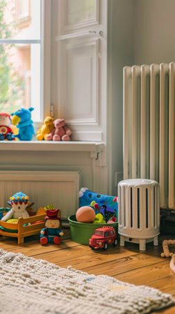 In a charming room, sunlight streams through the window, illuminating a vibrant collection of toys. A radiator stands nearby, providing warmth and comfort alongside an inviting atmosphere for play.