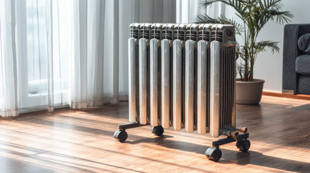 A sleek metal radiator positioned on wheels in a contemporary living room, illuminated by natural sunlight. This image captures warmth and comfort.