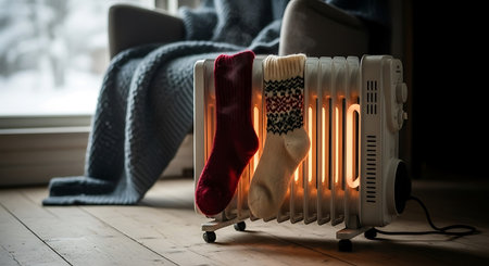 Red warm socks on a hot oil filled electric heater against blue background. Dangerous using of 9 fins space heater. Portable household appliance for heating home in a cold season. Front view.