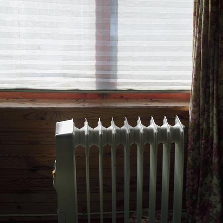 Close-up of modern radiator under window in cozy living space, symbolizing warmth, home comfort, and interior climate control.