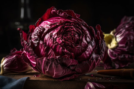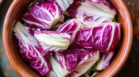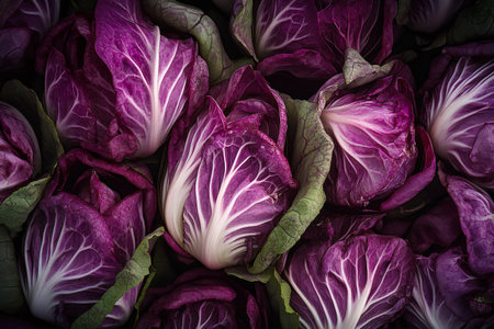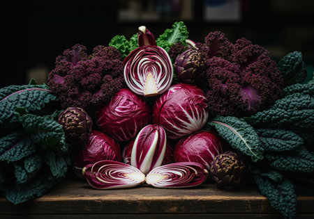 A visually striking arrangement of fresh purple radicchio, dark green kale, and other unique vegetables. perfect for culinary themes, healthy eating, or market displays.