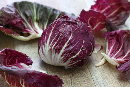 Radicchio Treviso or Italian chicory, red leaf vegetable standing on a rustic wooden table, copy space, selected focus, narrow depth of field