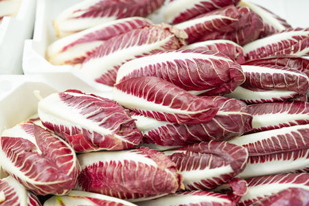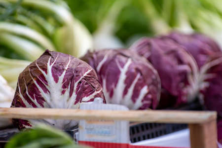 Lots of radicchio heads for sale in the market. Cichorium intybus is a popular plant in Western Europe