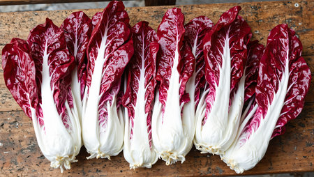 Freshly picked radicchio heads on wooden bench vibrant red and white leaves in sunlight