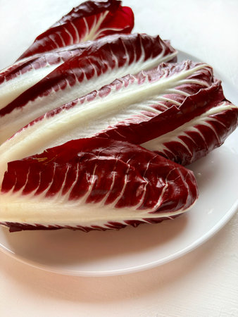 Red radicchio, a Treviso variety on a plate. It's a chicory with long, deep red leaves and white veins. Healthy and vegetarian food. Italian cuisine.