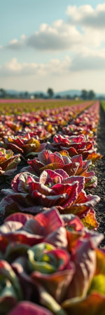 A field of vibrant red and yellow lettuce grows in rows under a bright sky