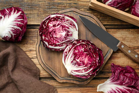 Fresh ripe radicchios on wooden table, flat lay