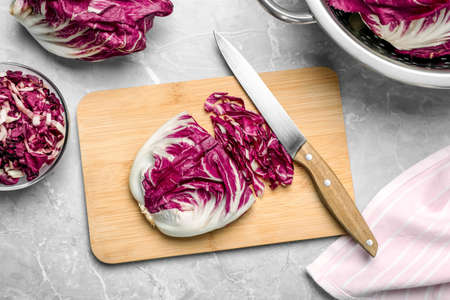 Whole and cut ripe radicchios on light gray marble table, flat lay