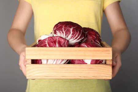 Woman with ripe radicchios on gray background, closeup