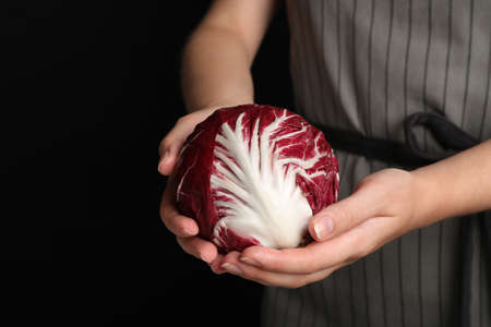 Woman with ripe radicchio on black background, closeup