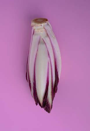 One fresh red chicory on a pink background