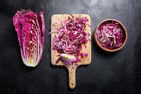 Chopped Red Chinese cabbage (Purple wombok) on wooden cutting board and bowl on stone table. Half Red Napa cabbage on black background, top view. Cooking vegetable salad, healthy food