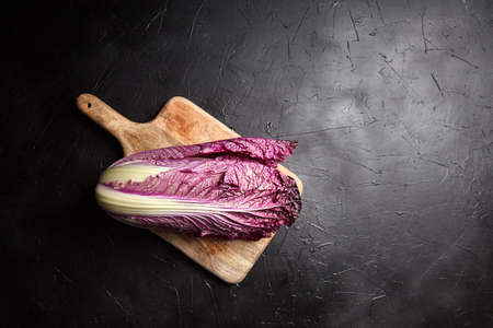 Wooden cutting board with Red Chinese cabbage (Purple wombok) on black stone background with copy space. Red Napa cabbage with vibrant colored leaves, healthy vegetable, top view. Asian cuisine
