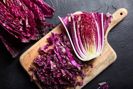 Chopped Red Chinese cabbage (Purple wombok) on wooden cutting board on dark stone table. Half of Red Napa cabbage on black background, top view. Cooking vegetable salad, healthy food