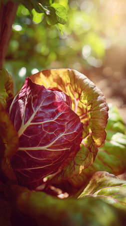 A sunlit portrait of a single Radicchio, photographed outdoors on a clear, breezy day. Fresh, crisp air renders vivid detail in the leave veins glowing with gentle backlight. The background falls into a soft natural bokeh of greenery, colors truetolife, organic beauty in pure sunlight.