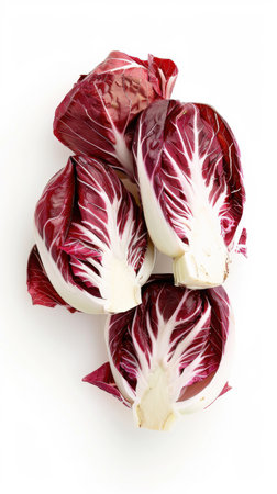 Vibrant red and white radicchio leaves are neatly arranged, showing their unique textures and colors. The contrast against the white background emphasizes their freshness and visual appeal.