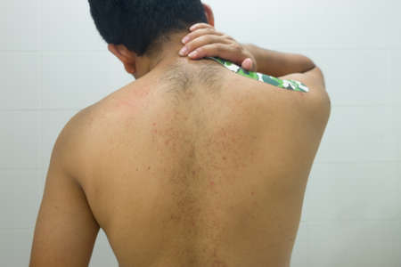 Back rash: skin condition with red spots on human back.