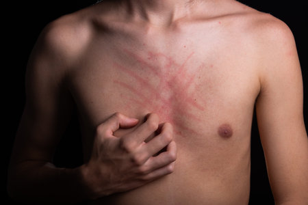 Chest of an angry man. Hand itching. Skin disease. Irritation, allergy. Isolated on black background.
