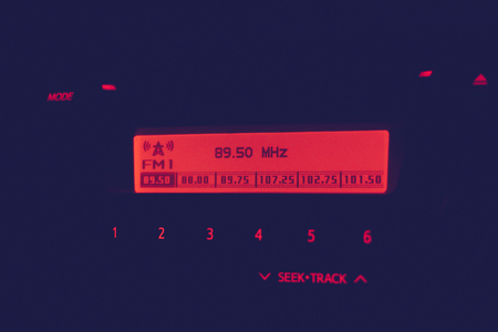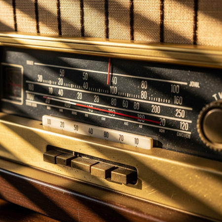 Vintage radio dial glowing warm light; antique receiver numbers frequencies; retro audio equipment close-up; classic broadcast technology music