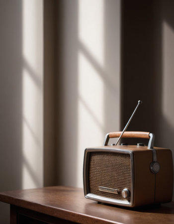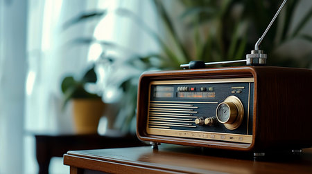 Elegant vintage-style wooden radio with gold details and extended antenna on a polished table. Soft, natural light creates a nostalgic, cozy indoor ambiance.