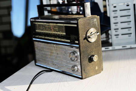 Old vintage rustic transistor radito with cassette recorder with dark wooden background