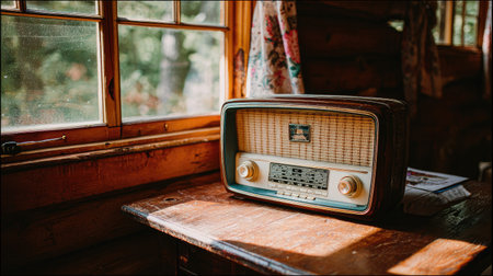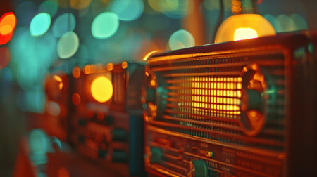 Defocused vintage radios tered and fading into the background evoke a sense of nostalgia for the golden age of radio waves and simpler times.