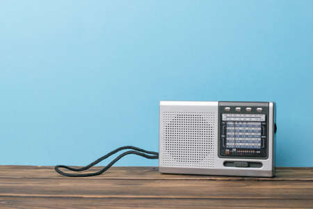 Silver retro radio on a wooden table on a blue background. Vintage radio equipment.