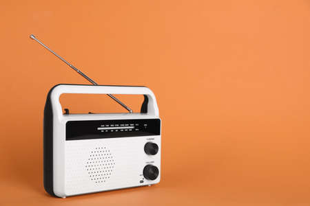 Portable retro radio receiver on orange background. Space for text