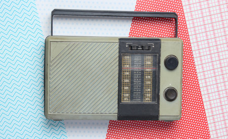Retro radio receiver on creative background. Top view, minimalism