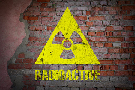 Yellow radioactive sign on old brick wall. Radiological pollution