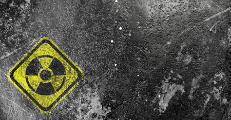 Yellow radioactive sign on grey textured background, banner design. Radiological pollution