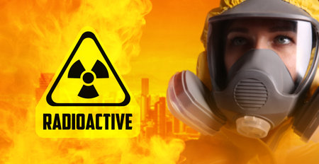 Radioactive hazard. Woman in hazmat suit and gas mask against polluted city. Warning sign in smoke