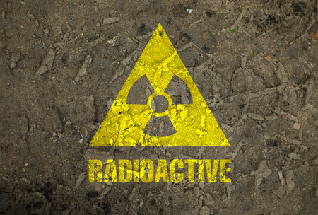 Yellow radioactive sign on brown ground, top view. Radiological pollution