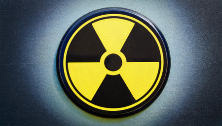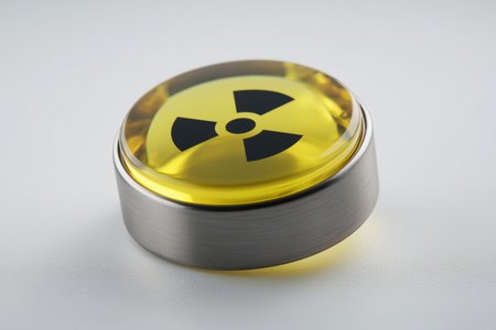 Close-up showcases a bright yellow radiation symbol button, highlighting nuclear risks, safety measures, and the importance of awareness of potential hazards.