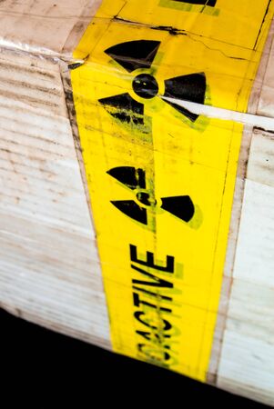 Radioactive (atomic ionizing radiation) danger warning symbol in triangular on a black case. Black suitcase with a sign of radiation hazard. Dark background.