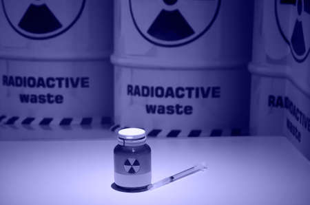 liquid container and syringe on the background of barrels of radioactive waste. photo toned in the color of the year very peri.